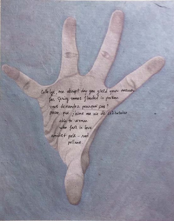 Chữ viết tay trích đoạn “Callalys, em đến”, trang 63 – “Họ, bộ hư ảo”, trên tranh in trên giấy Dó Nhật, khung gỗ.