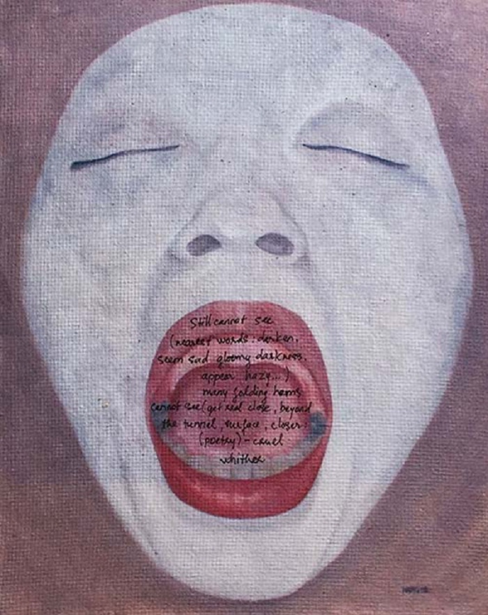 Poem No.1, page 35, episode 1 “Cửa sổ đập” – “Current Times, Good Sensations, and Reasonable Insanity” hand written on painting printed on Japanese Dó paper, wooden frame.