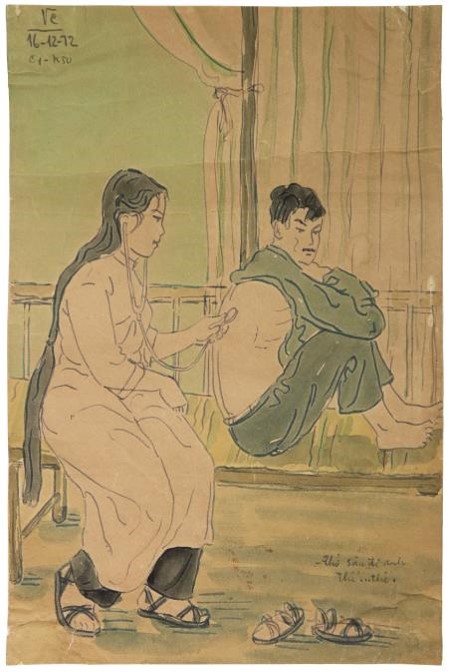 b.1944, Nam Dinh Ngô Viễn Chí (born as Vũ Hữu Xưởng) started studying drawing and painting at a young age before joining the North Vietnamese army in the early 1960s. He specialized in documenting the war effort in the resistance (Viet Cong) controlled areas, including weapons manufacturing, growing of medicinal plants and the preparation of medicines. Chí became an accomplished watercolour painter, with notable works that were widely exhibited, including 40 Năm Kháng Chiến, 40 Resistance Years; Kho Tàng Cục Hậu Cần Miền Đông Nam Bộ, Treasury Department of Logistics of the South East (1974); Chợ Cá Sông Đốc Cà Mau, Fish Market of Đốc River, Cà Mau province; Tàu Bạn Vào Cảng Sài Gòn, Friendship Ship comes to Saigon port (1978); Đồ Hộp Tân Bình, Canned Food, Tân Bình (1980).